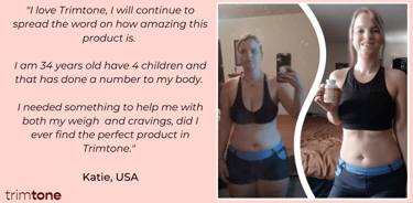 Katie (United States) shares, “I love Trimtone! I started taking it in September, and by February, I saw a change of over 30lbs. It helped me with both energy and cravings. I’m 100% satisfied with this product.”