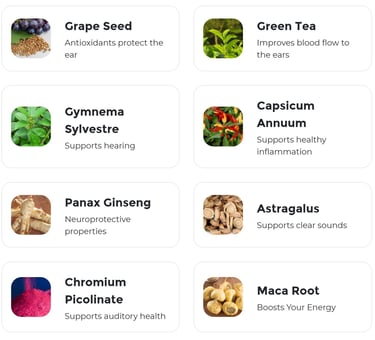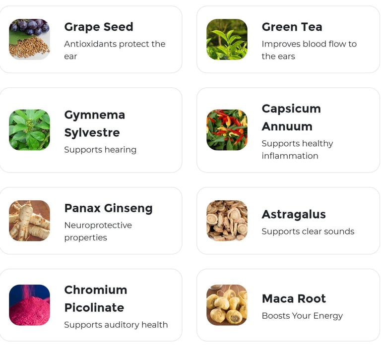 🔹 Grape Seed Extract – Provides antioxidant protection for the inner ear, reducing tinnitus and noise-induced hearing loss.